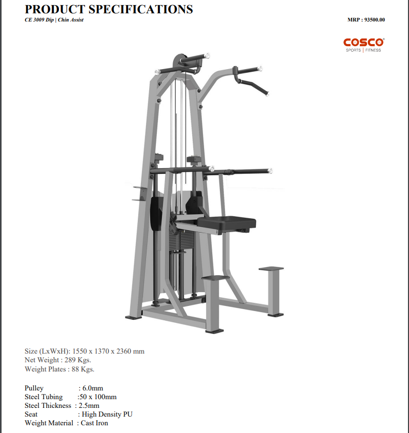 Size (LxWxH): 1550 x 1370 x 2360 mmNet Weight : 289 Kgs.Weight Plates : 88 Kgs.